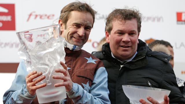 Franck Leblanc aux côtés de Jean-Michel Bazire lors de la victoire d’Up and Quick dans le Prix d’Amérique – AFP